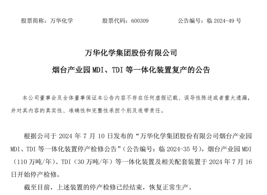9月9日,萬華化學(xué)煙臺產(chǎn)業(yè)園 MDI(110 萬噸/年)、TDI(30 萬噸/年)等一體化裝置及相關(guān)配套裝置于2024年7月16日開始停產(chǎn)檢修。截至目前,上述裝置的停產(chǎn)檢修已經(jīng)結(jié)束,恢復(fù)正常生產(chǎn)。