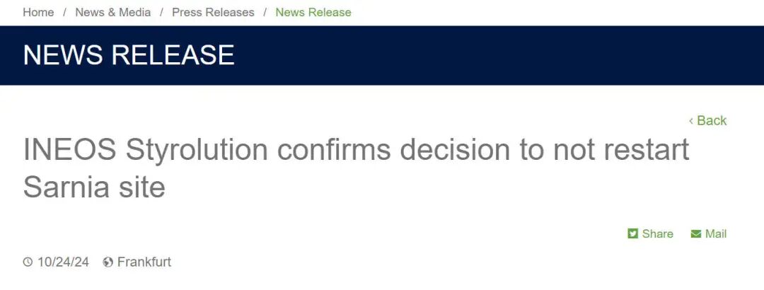 10月24日,英力士苯領(lǐng)發(fā)布公告稱,確認(rèn)決定不重啟位于加拿大安大略省薩尼亞(Sarnia)市的苯乙烯工廠。預(yù)計(jì)在2025年第四季度初完成工廠關(guān)停進(jìn)程。